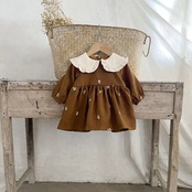 小さな女の子のためにデザインされた可愛らしい花柄の綿のドレスです!襟を折りたたんだデザインが特徴で、長袖なので秋の肌寒い日にもぴったりです。おしゃれな花柄が、お子様の愛らしさを引き立て、特別な日やお出かけにも最適です。